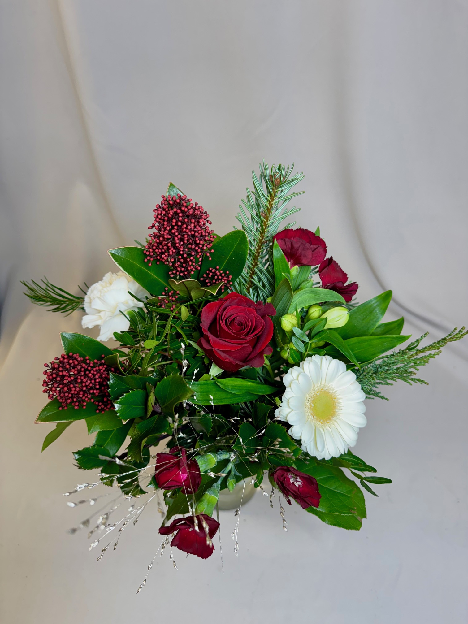 Årets julbukett är en traditionell mix av rött och vitt mot en bas av vintergrönt. Bildens bukett är storlek liten.