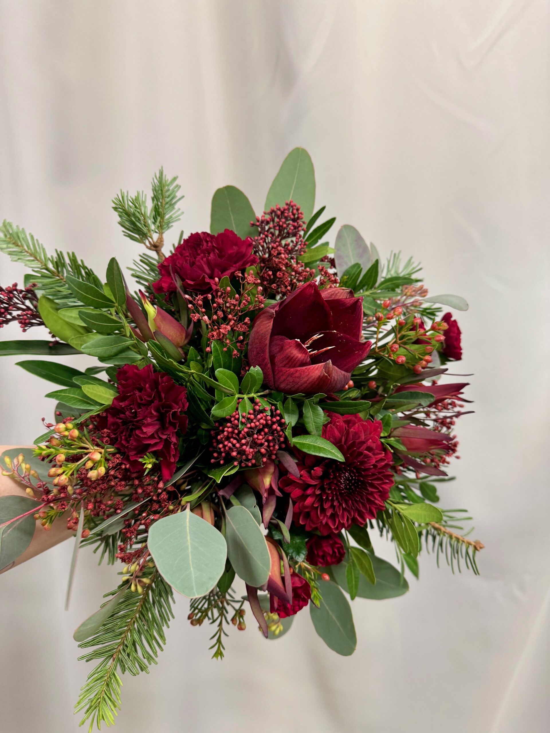 En festlig julbukett i djuprött mot en bas av vintergrönt och eucalyptus. Bildens bukett är storlek mellan.