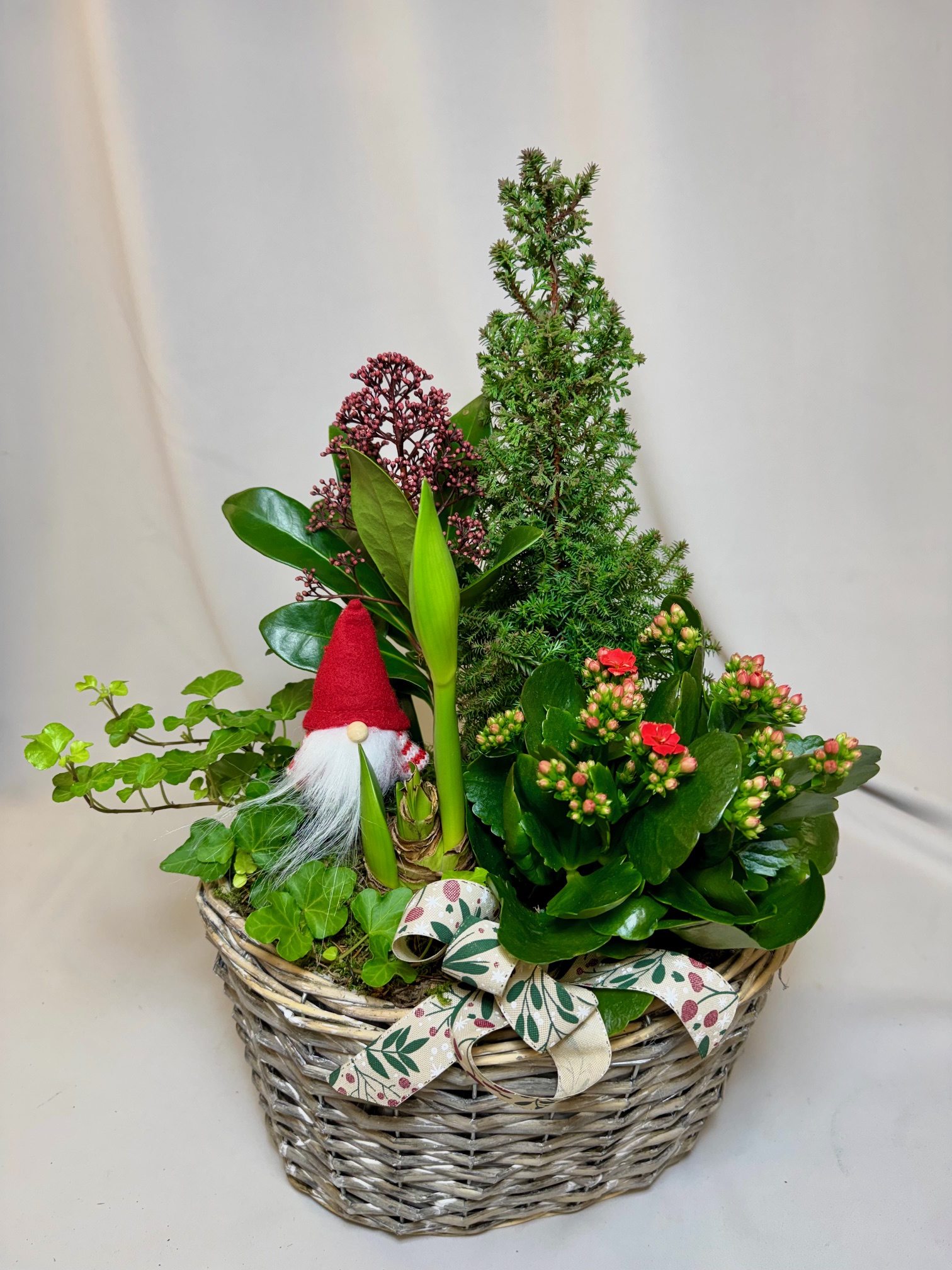 En traditionell och hållbar julkorg med amaryllis. Bildens korg är storlek mellan.